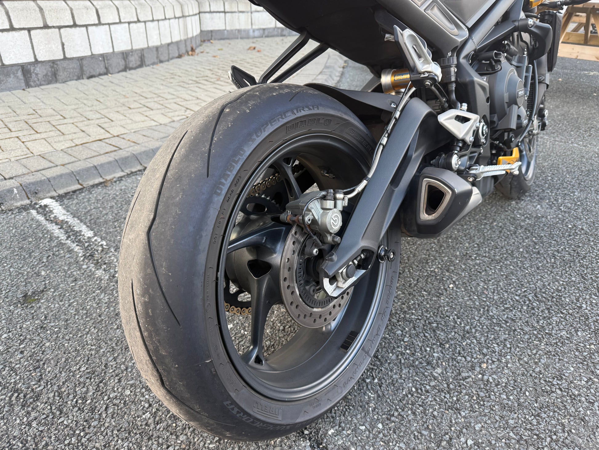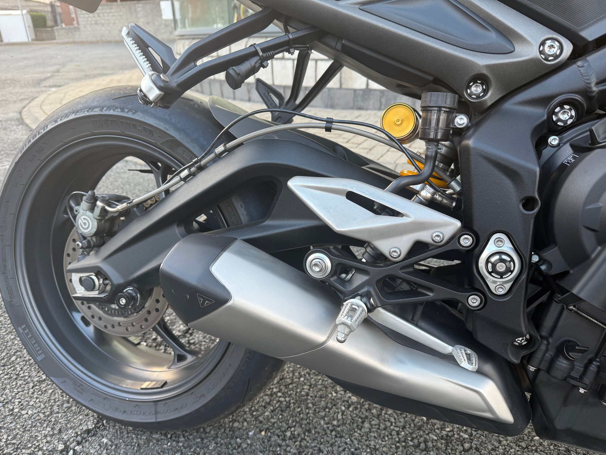 We have this beautiful 2023 Triumph 765 Street Triple RS for sale. It’s the gorgeous RS spec which includes the likes of the Brembo M50 Monobloc callipers, fully adjustable Showa forks and an Ohlins STX40 rear shock. The RS spec also features a quick shifter and a lap timer built into the 5” TFT colour display dash. It’s such a stunning colour in the flesh and has been fitted with lots of great accessories! Finance is now available on this Street Triple RS in store!